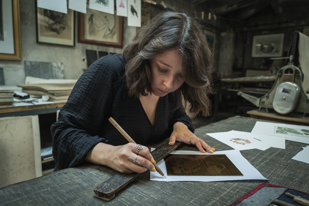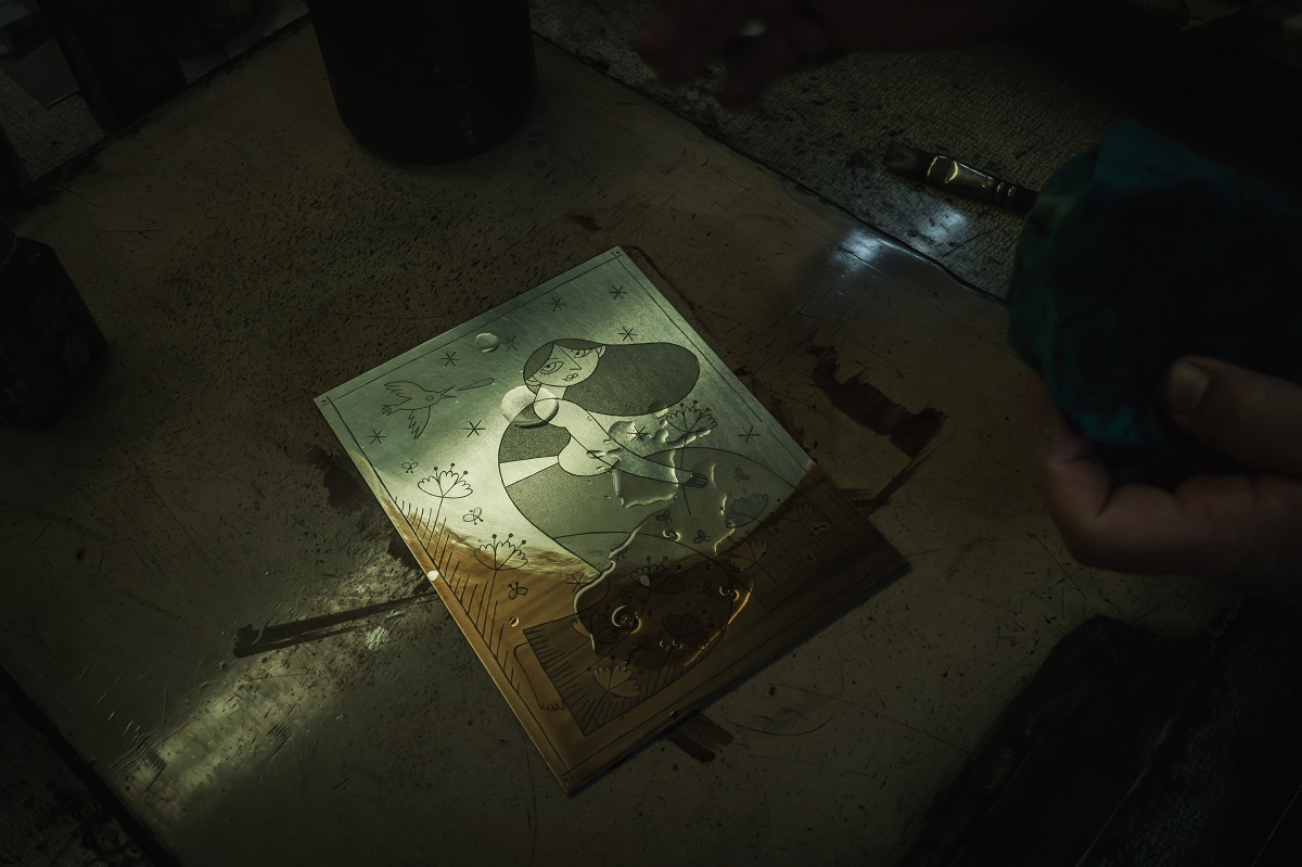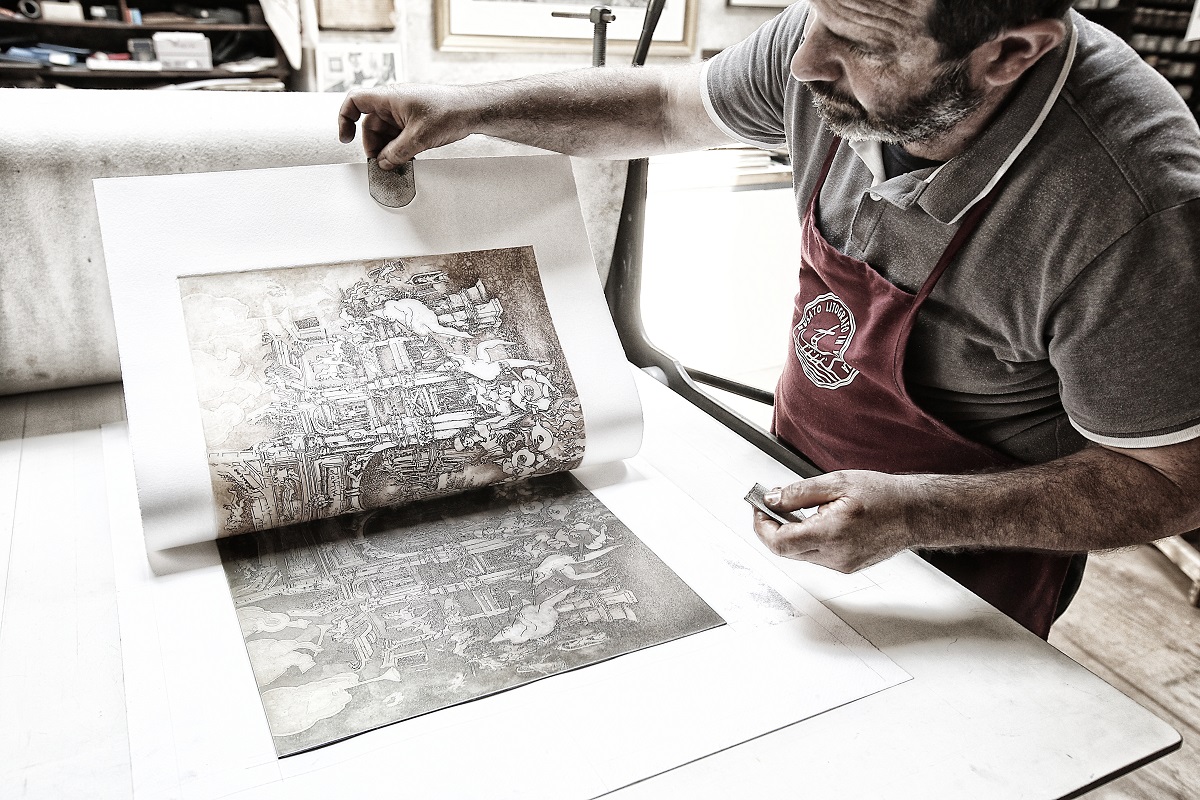 Alice è un’ illustratrice vicentina che, grazie alla collaborazione con Giancarlo, realizza acqueforti ed acquetinte che talvolta rifinisce ad acquerello. L’acquaforte è una tecnica calcografica indiretta; si incide sopra una vernice che protegge la superficie della lastra metallica con una punta sottile, generando un segno libero e spontaneo, che diventerà il solco nel quale verrà trattenuto l’inchiostro dopo la morsura; con l’acquatinta invece si ottengono gli effetti chiaroscurali. Queste sono le tecniche di stampa predilette da Alice, entrambe si prestano al suo stile: linee sottili, tratteggi, campiture colorate e cura dei dettagli. Giancarlo aiuta e guida gli artisti nel loro processo creativo, fornendo loro consigli, strumenti ed attrezzature; gli artisti mantengono sempre vivo e dinamico questo luogo magico, a due passi dal Teatro Olimpico, che sarà anche la sede di questo laboratorio.