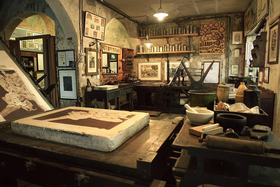 Entrando in Stamperia ci si immerge in un vero e proprio viaggio sinestetico: le vista delle stampe e delle matrici, l’odore degli inchiostri, ed il desiderio di toccare il legno del torchio, la pietra litografica e gli attrezzi per l’incisione.
